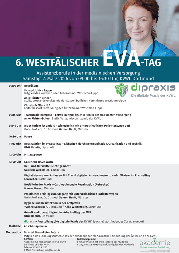 Die “Entlastende Versorgungsassistenz (EVA)” erwirbt die Kompetenzen für die Übernahme von Delegationsfähigen Leistungen in der ambulanten Praxis. Sie entlastet dadurch die Ärztinnen und Ärzte bei der Begleitung und Unterstützung von Patientinnen und Patienten und Angehörigen in einer Vielzahl von Aufgabenbereichen, die den Behandlungsprozess betreffen. Das Konzept der “Entlastenden Versorgungsassistenz (EVA)” entspricht dem Fortbildungscurriculum “Nicht-ärztliche Praxisassistentin” gemäß § 87 Abs. 2 b Satz 5 SGB V der BÄK und sieht eine Spezialisierungsqualifikation von medizinischen Fachangestellten vor.